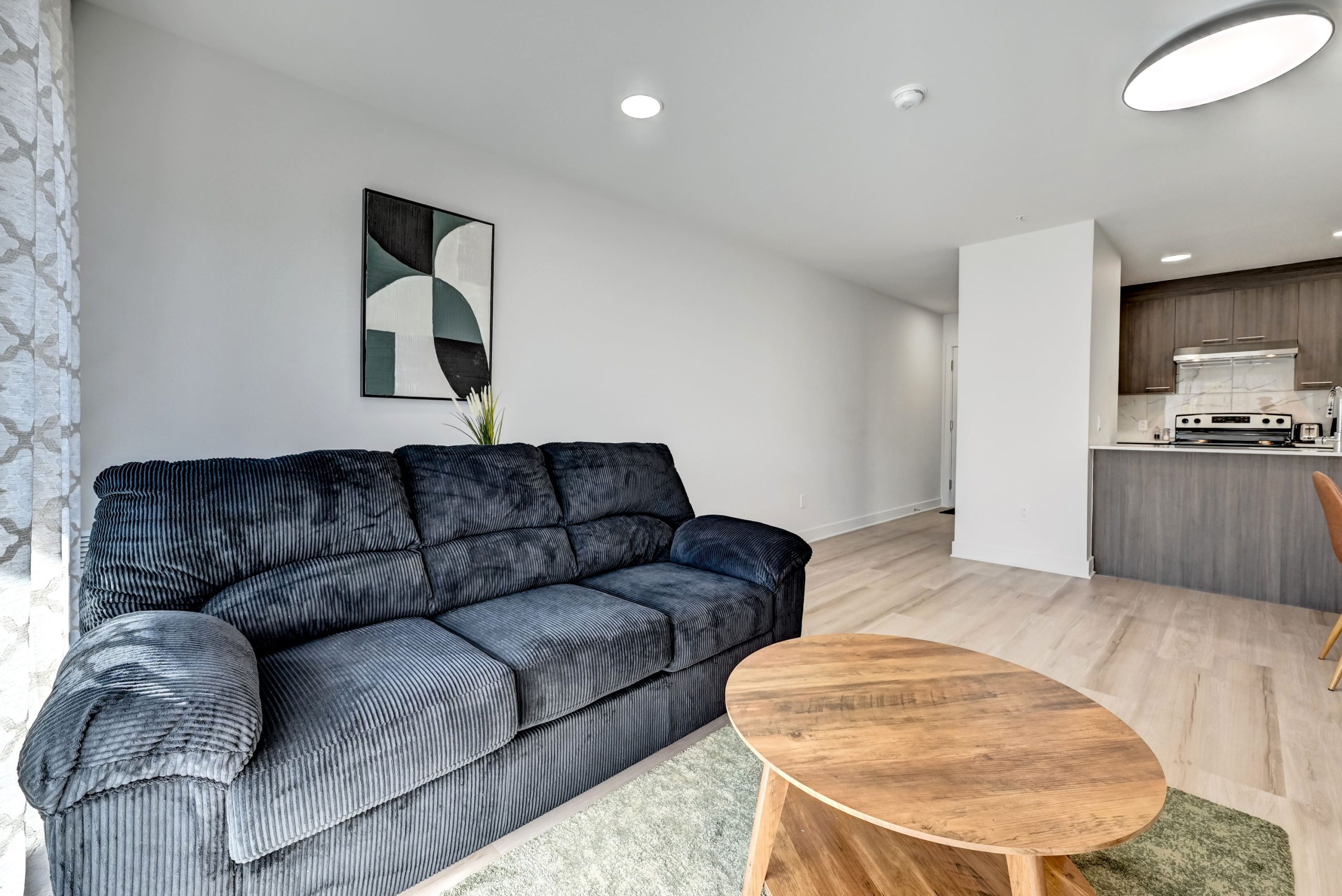 Le salon, vaste et baigné de lumière grâce à ses grandes fenêtres, invite aussi bien à la détente qu’aux moments de convivialité. La chambre principale, équipée d’un lit queen-size promet des nuits paisibles et réparatrices. La seconde chambre, dotée d’un lit double, offre un espace confortable et pratique pour accueillir la famille ou les invités.