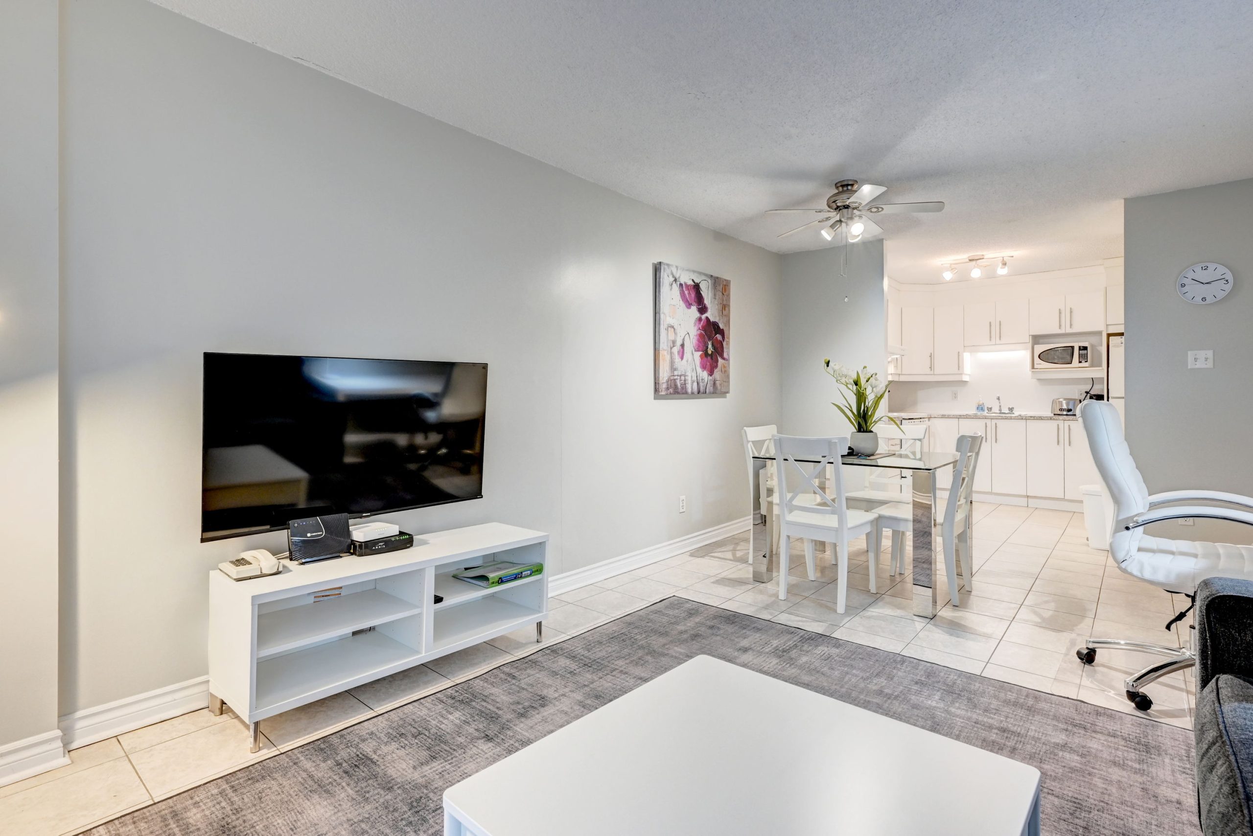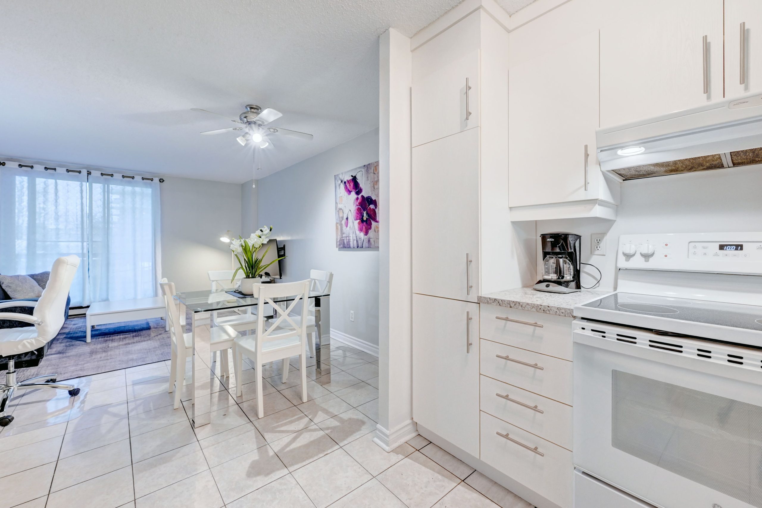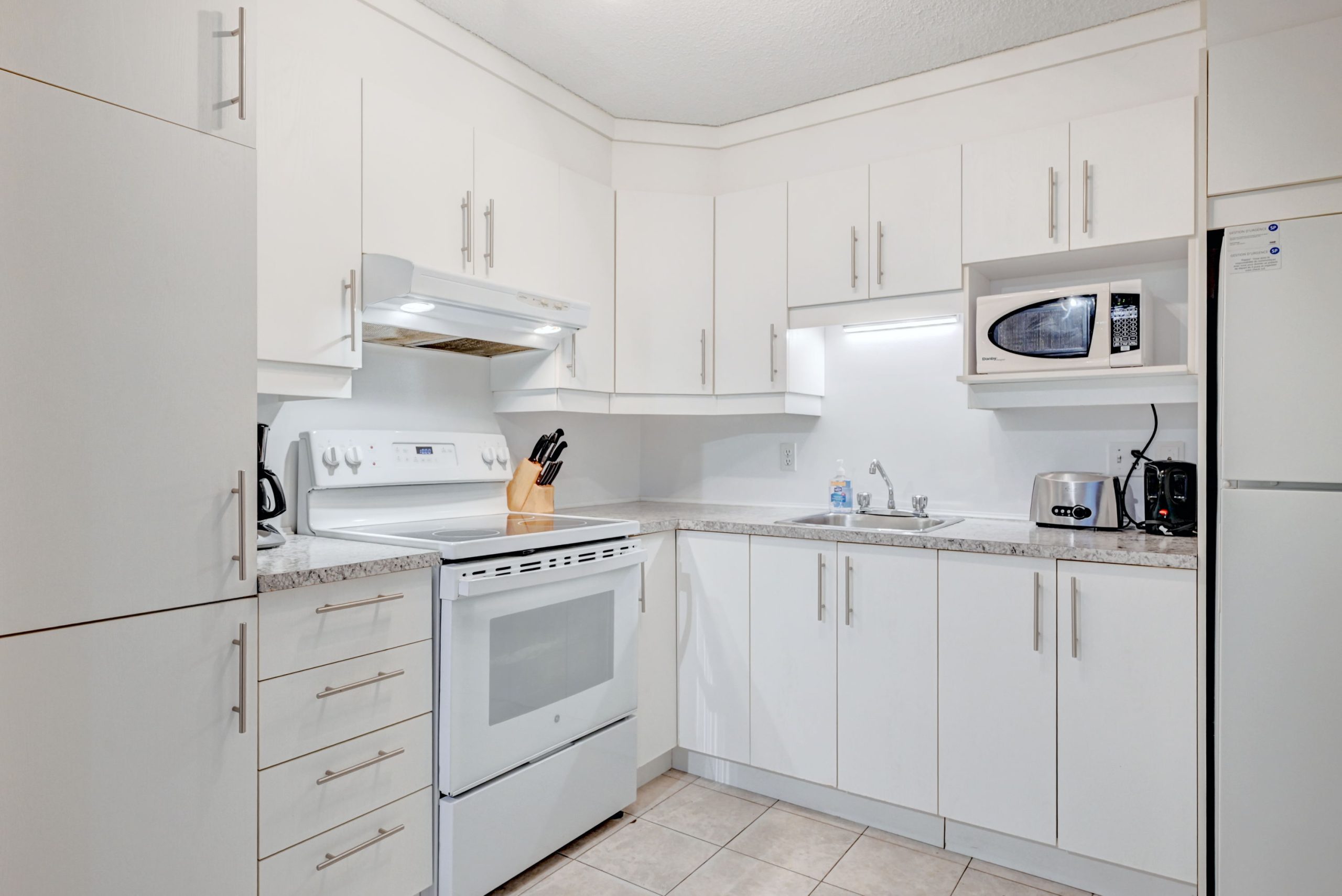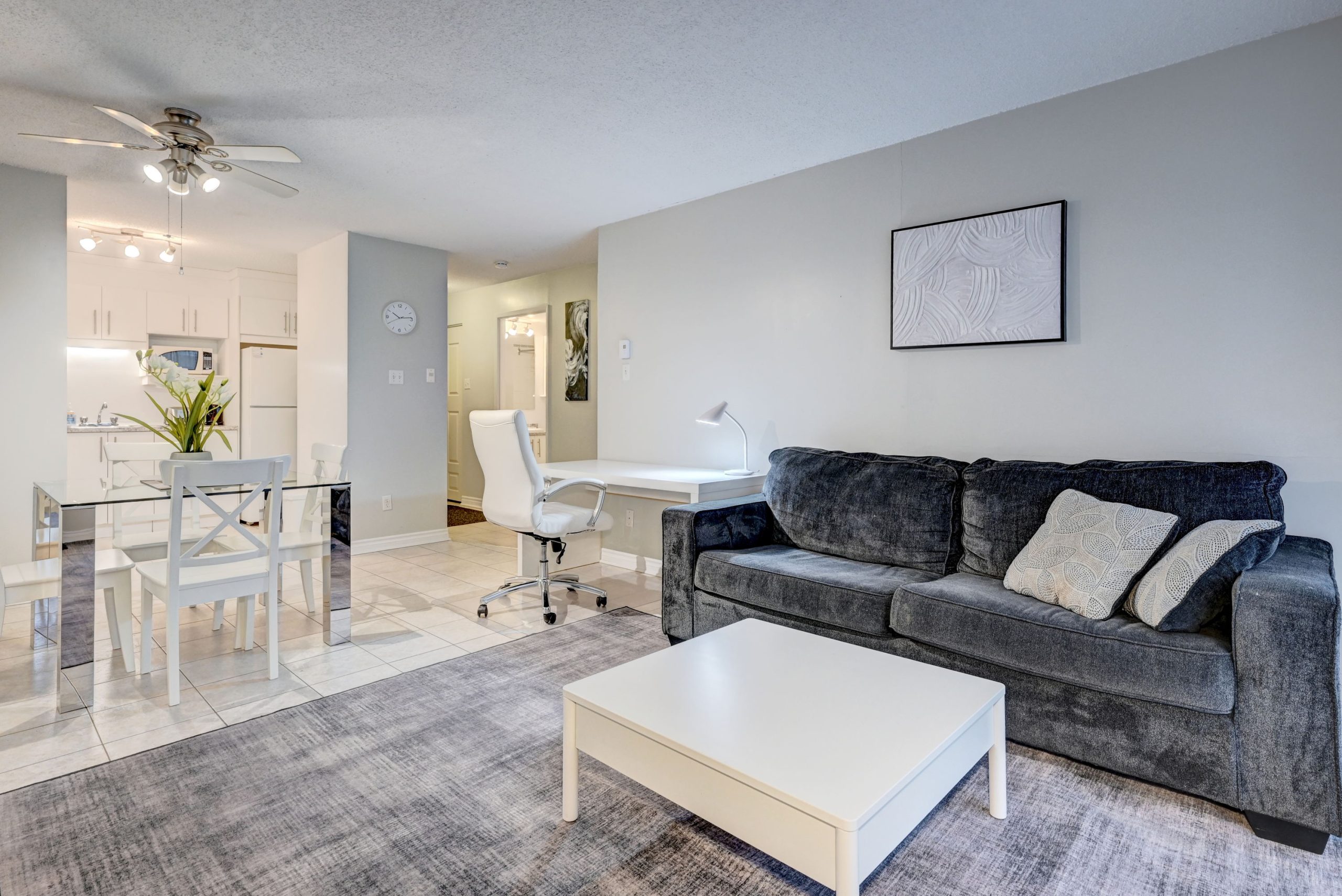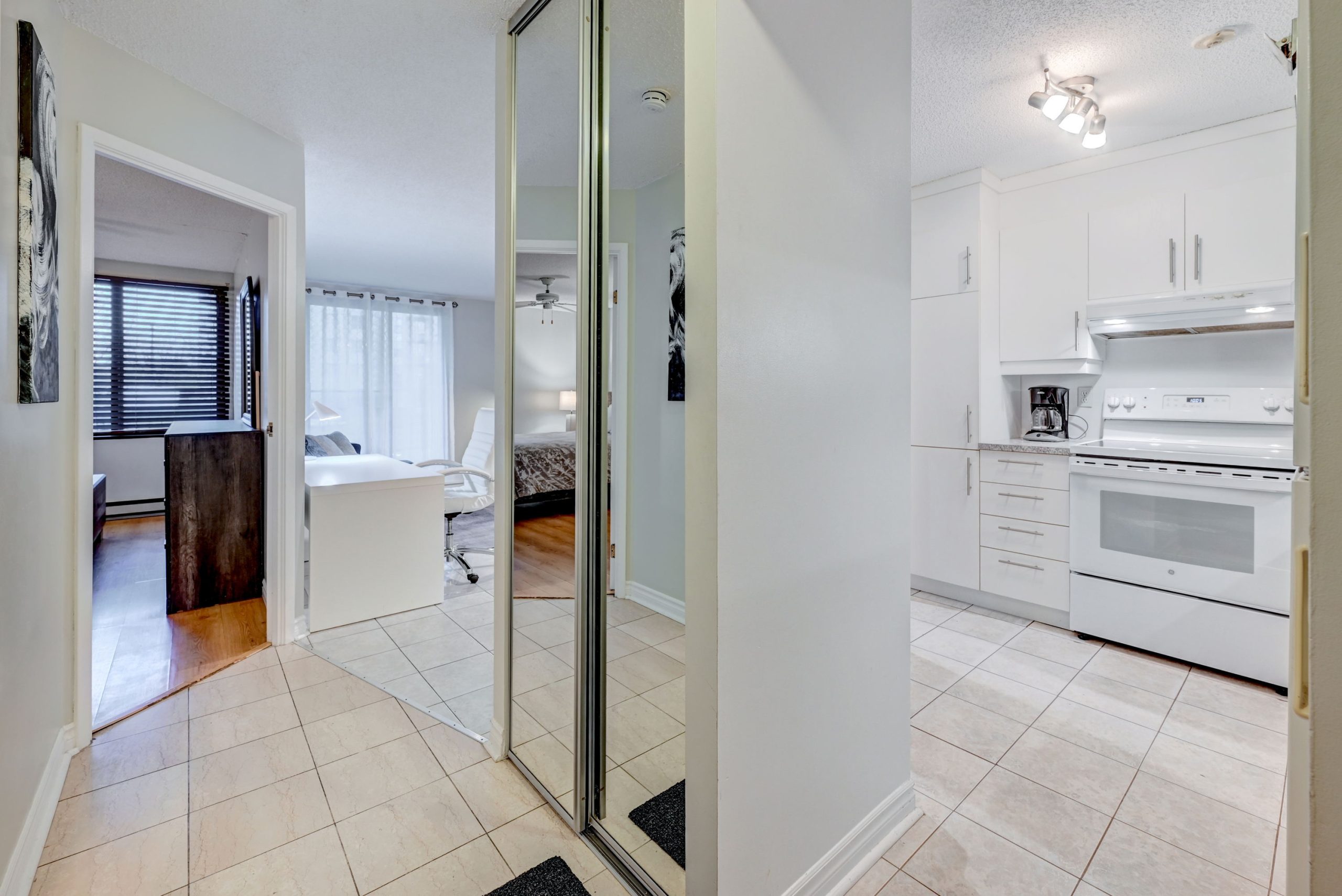 Un salon avec cuisine ouverte entièrement équipée et meublée, une chambre avec lit Queen ainsi qu’une salle de bain complète.