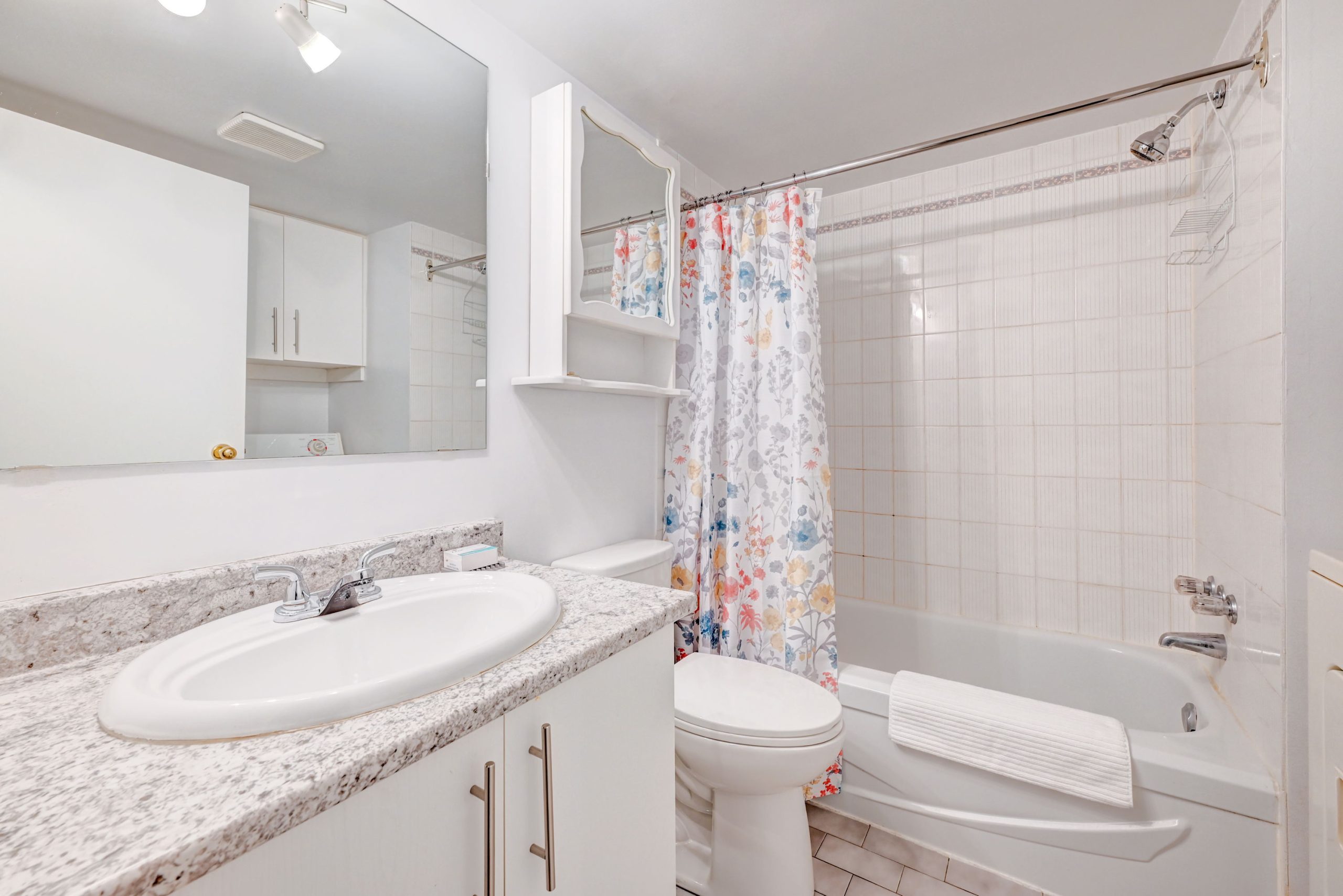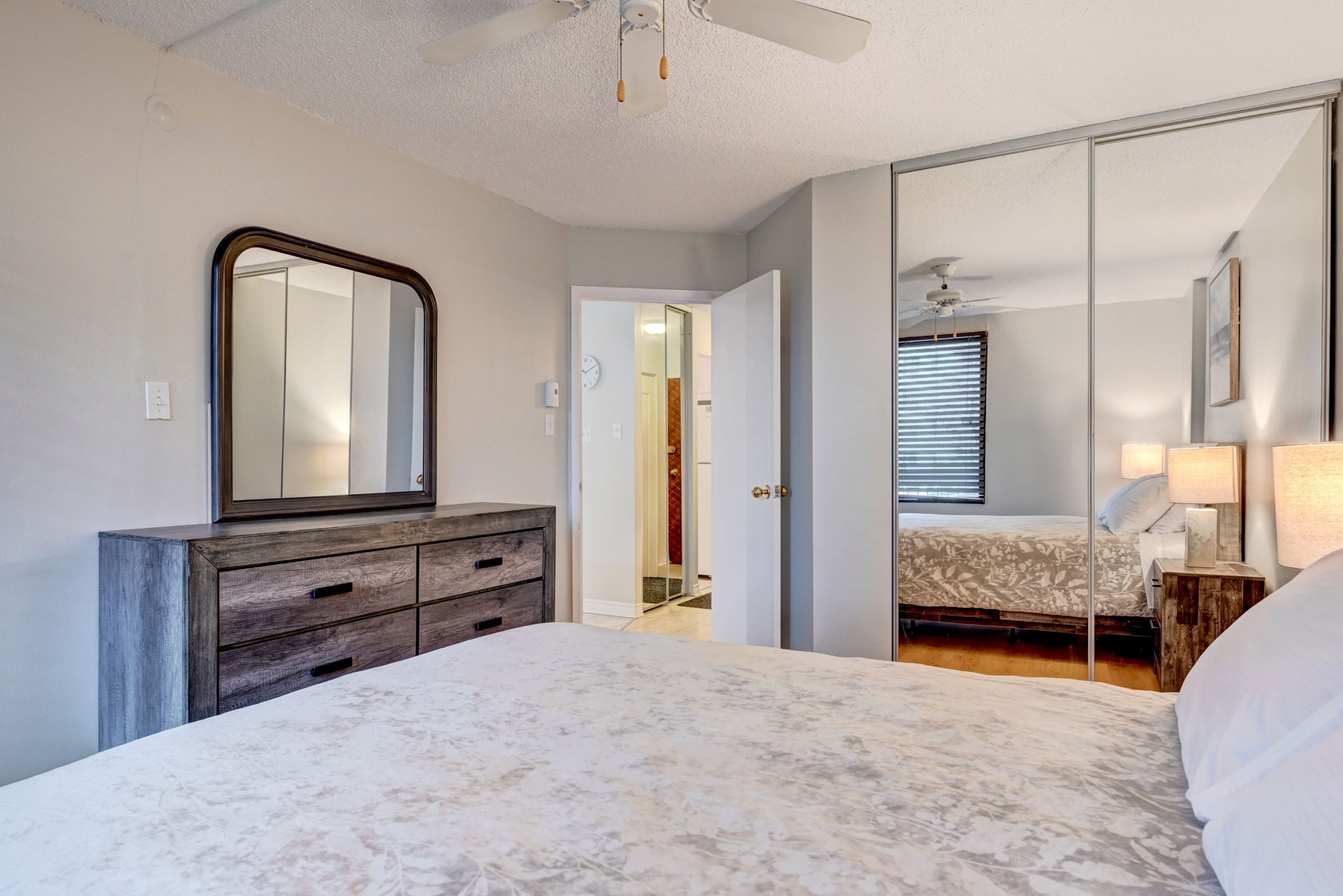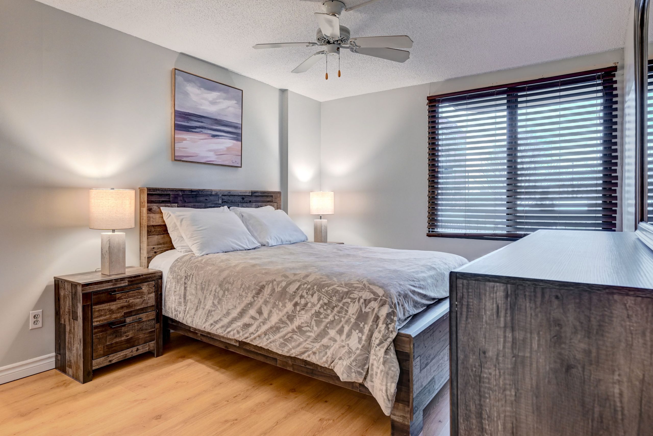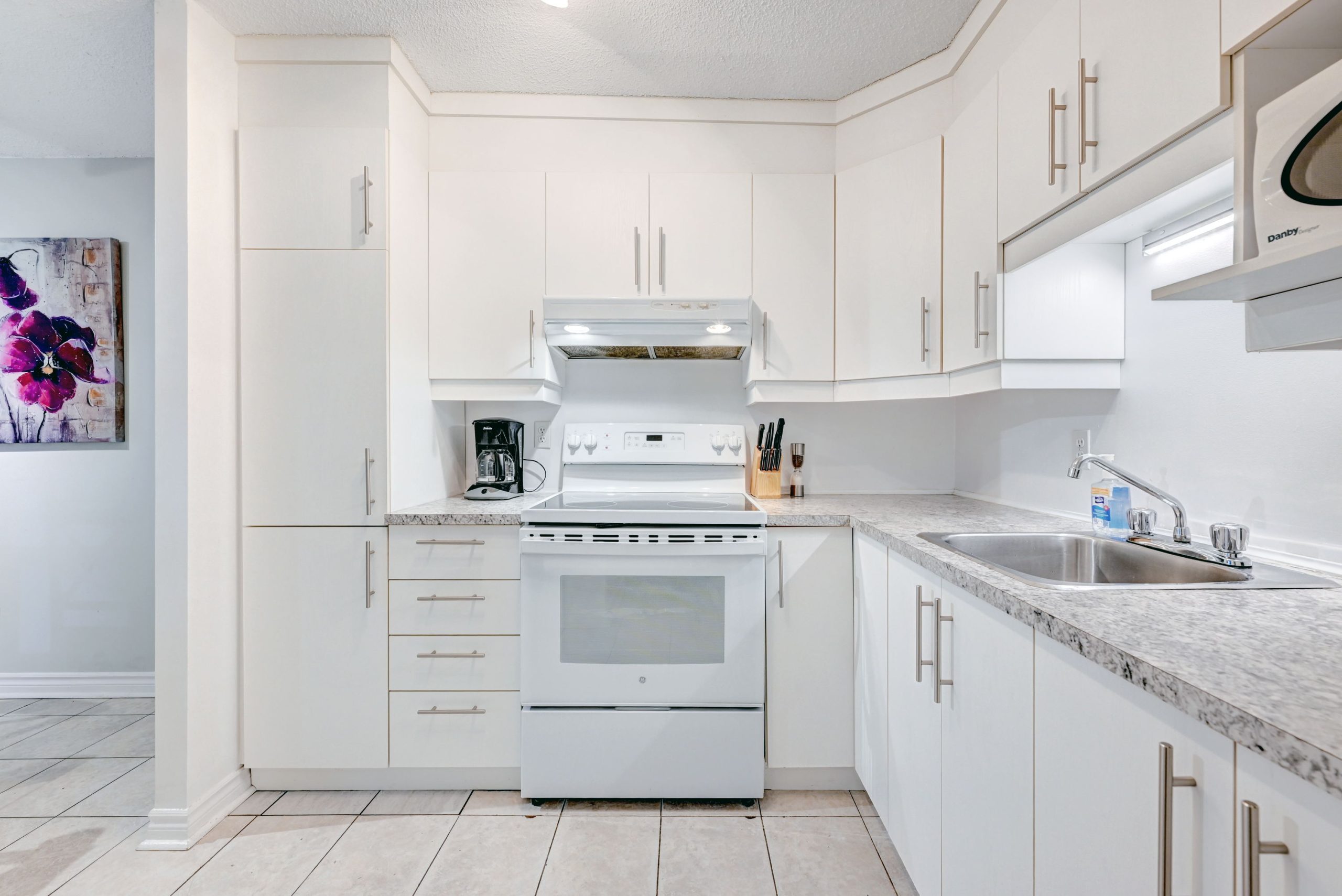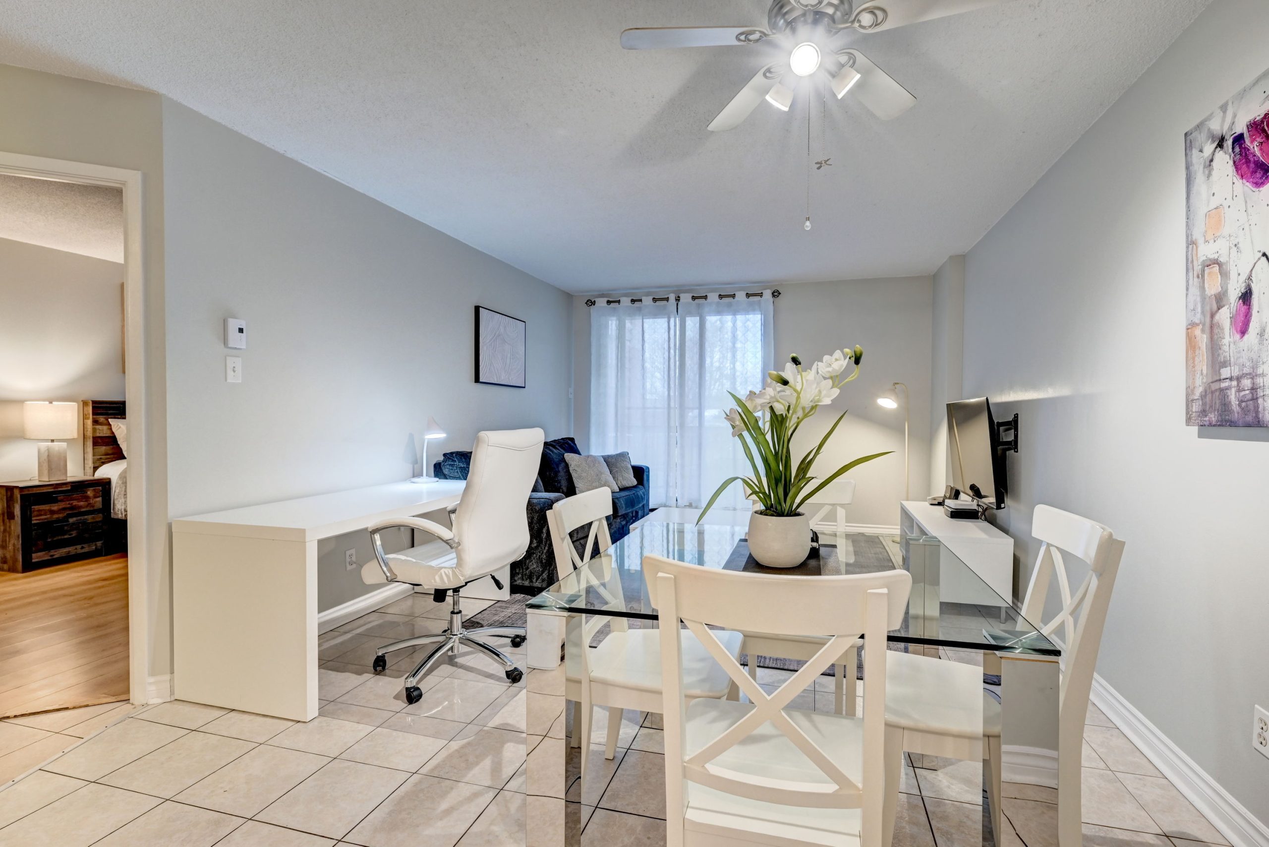 Un salon avec cuisine ouverte entièrement équipée et meublée, une chambre avec lit Queen ainsi qu’une salle de bain complète.